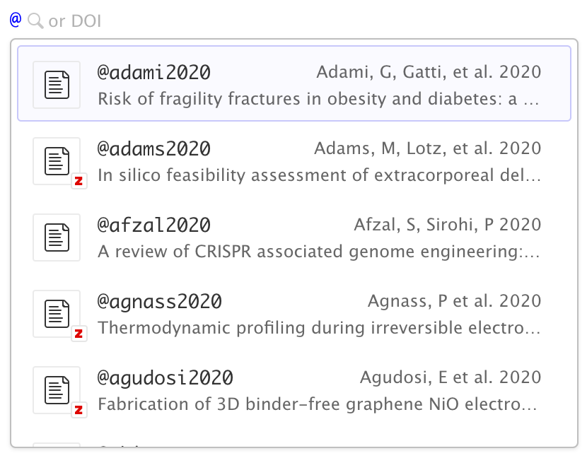 Zotero is a popular free and open source reference manager. The Quarto visual editor integrates directly with Zotero, enabling you to use the Insert Citation command to use references from your Zotero libraries: