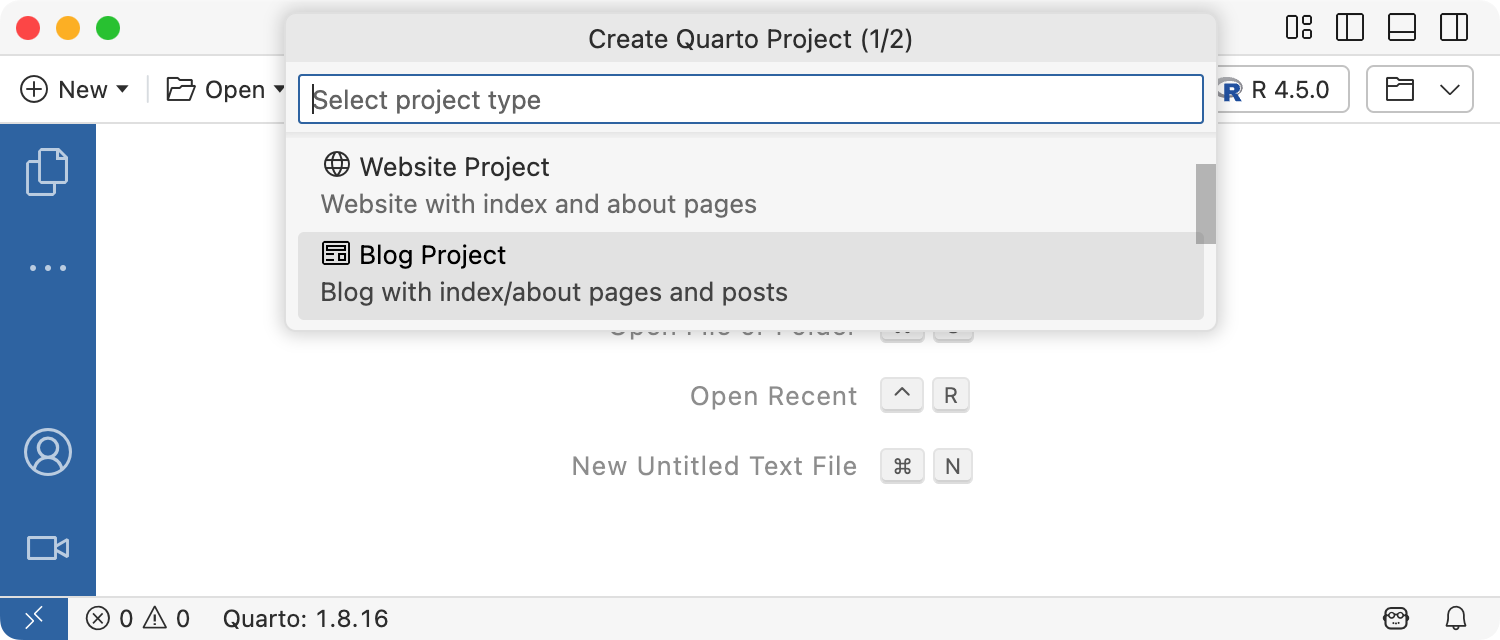 To create a new blog project within RStudio, use the New Project command and select Quarto Blog: